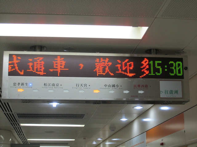 蘆洲線月台的新設計吧?列車的現在位置在月台上也有標示,不過上面的跑馬燈...列車到站時間一直變來變去,看到顯示一分鐘到站轉過頭又變成三分鐘...或許要再改正。