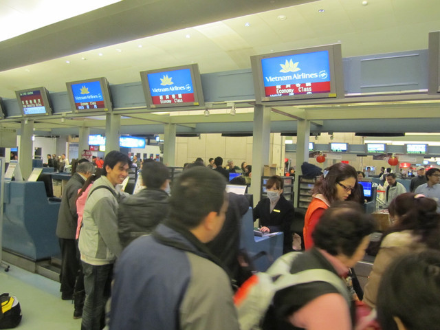 而越南航空的報到櫃台在第一航廈,由華航代理地勤服務。