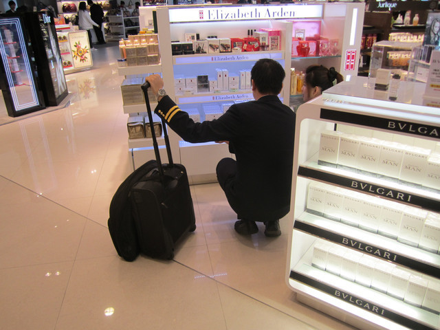 下圖的男性空服員(袖子上只有兩條黃線噢)在看保養品。