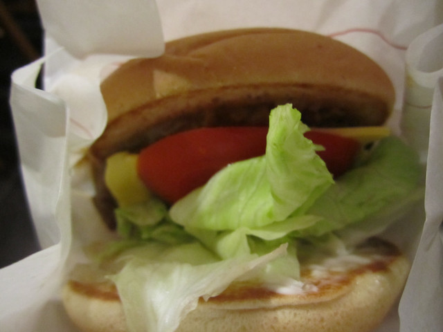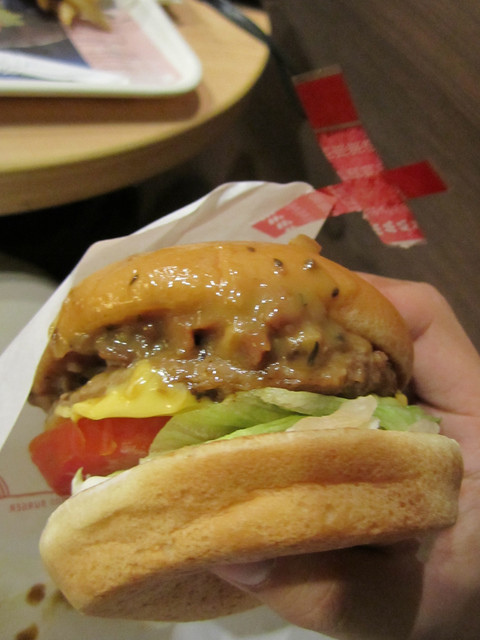 又等了一段時間,我的大薯和漢堡總算來也。上次其實有吃過這個漢堡,不過牛肉有點大片,最後麵包沒了只能啃牛肉讓我印象不是很好...今天一打開漢堡,培根的香氣撲鼻而來,可能是醬多的關係吧!聞起來真的很吸引人從後面看,其實牛肉也沒有特別大片啊(醬的色澤好誘人),可是吃到後來還是跟上次一樣單吃牛肉...