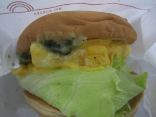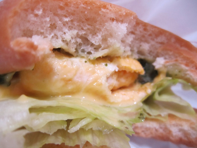 期待已久的漢堡總算登場了!聞起來並沒有特殊的香氣(跟法式蕈菇醬牛肉堡的培根味相比啦),外觀上看起來有蛋和生菜還有融掉的起士,另外還有一些白醬。