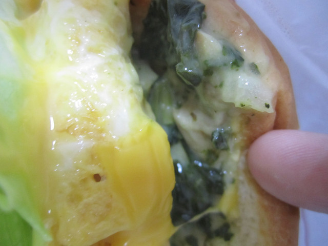 把漢堡的麵包撥開,看到的是滿滿的菠菜和白醬!仔細聞總算有聞到一點香味